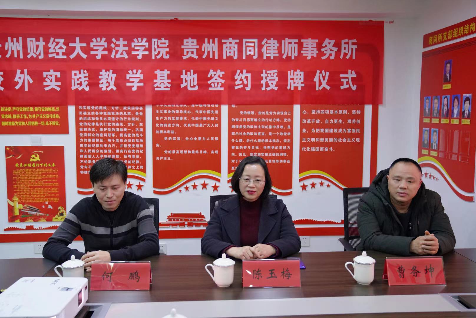 签约暨授牌仪式由贵州商同律师事务所党支部书记王军主持,王军首先对陈玉梅院长一行的到来表示热烈的欢迎和真诚的感谢,并介绍了贵州商同律师事务所成立及发展历程。陈玉梅院长对KAIYUN.COM·开云「中国」官方网站的发展历程、师资情况、人才培养和社会服务等方面做了介绍,希望以设立校外实践教学基地为平台丰富课堂教学内容,加强教学理论与实践的结合,提高学生综合素质和社会适应能力。
