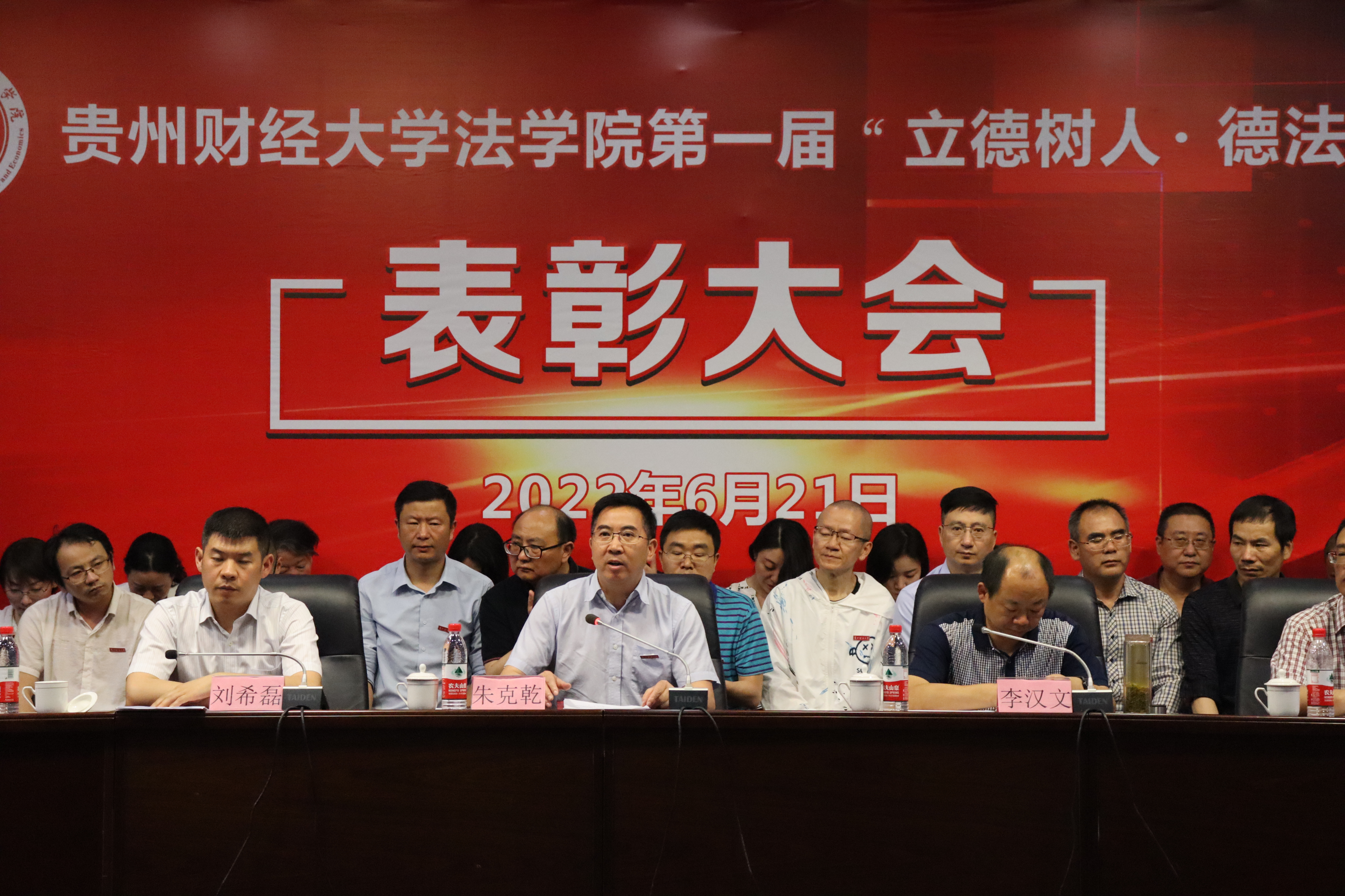 (法学院 图文/报道 向涛)为表彰2021年在各自的工作、学习岗位上为法学院发展作出贡献的教师和学生,起到树典型引路、立标兵育人、营造浓厚学术氛围的效果,法学院6月21日下午在图书馆报告厅,召开第一届“立德树人 德法兼修”表彰大会。学校党委副书记朱克乾,副校长李汉文,学生工作部、武装部部长刘希磊莅临大会。包括2022届本科和硕士毕业生在内的法学院全体师生700余人,通过线上线下形式参加会议。会议由法学院副书记、院长陈玉梅主持。