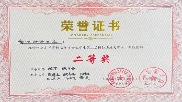 (法学院 图文/报告 顾青云)2023年3月25日,由贵州省高等学校法学类专业教学指导委员会主办,贵州警察学院承办的“贵州省高等学校法学类专业学生第二届模拟法庭大赛决赛”如期举行。由我院法学院程宇、杨森井、陈体贵老师带队参赛的贵州财经大学代表队在经过激励的角逐后,荣获“贵州省高等学校法学类专业学生第二届模拟法庭大赛”亚军暨二等奖。